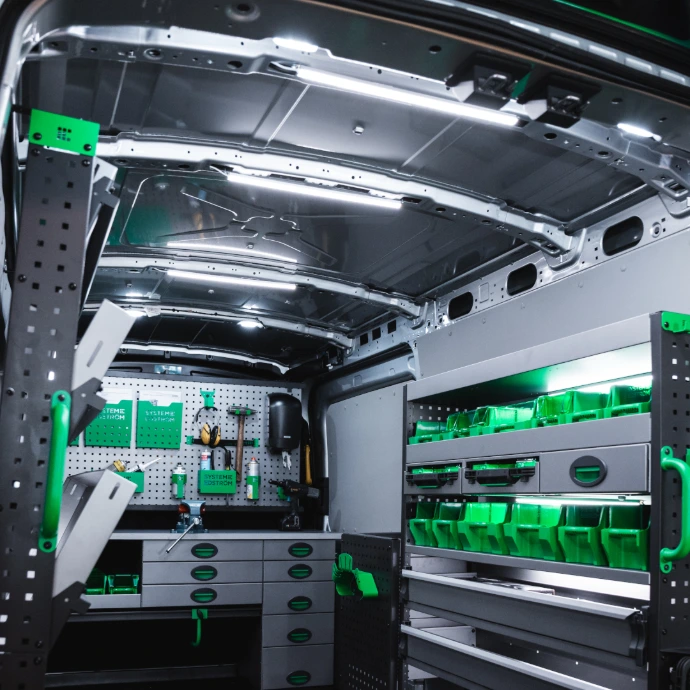 Eine gut angepasste und moderne Einrichtung in Ihrem Arbeitsfahrzeug ist selbstverständlich von großer Bedeutung, sowohl in puncto Sicherheit als auch Effizienz. Lassen Sie Ordnung und Übersicht zu Ihren Leitprinzipien werden. Sorgen Sie dafür, dass Sie den Platz im Fahrzeug mit Beleuchtung, Regalen, Schubladen und anderen praktischen Einrichtungsgegenständen und Lösungen optimieren.